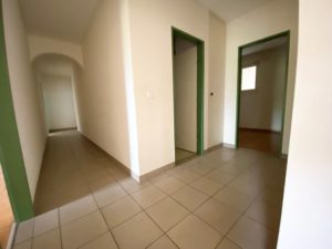 L’appartamento è così composto: atrio, cucina ad angolo con tutti gli elettrodomestici, openspace con spazioso salotto, corridoio che collega le quattro stanze, due bagni (tutti e due con vasca, bidet e wc) e due piccoli armadi a muro. Balcone verso il giardino.