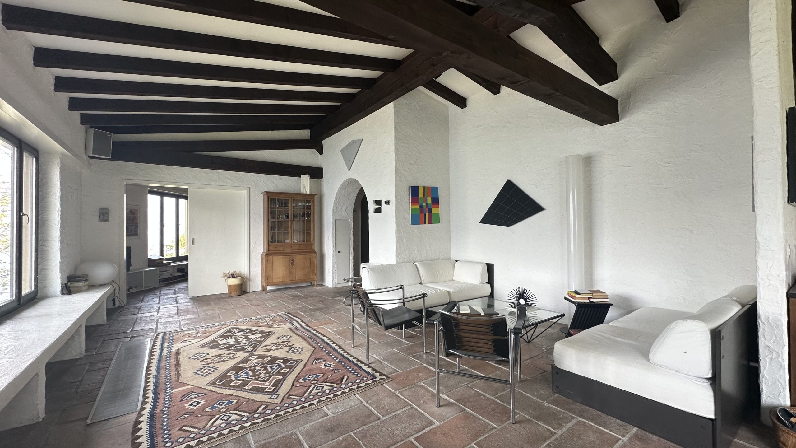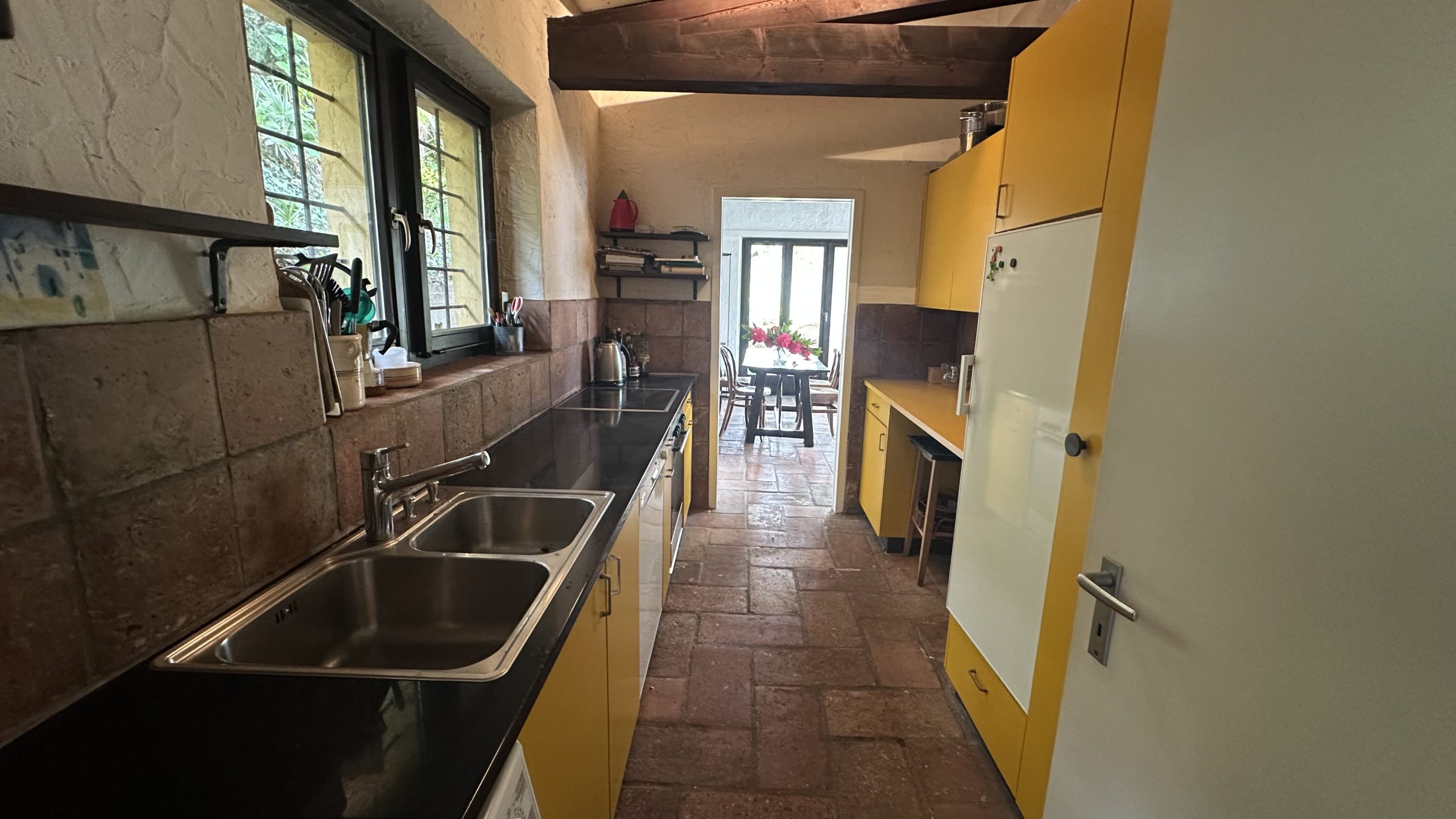 Im Erdgeschoss befinden sich: ein einladender Eingangsbereich, ein Gäste-WC, ein großes Wohnzimmer, ein Esszimmer, eine Wohnküche, ein Schlafzimmer und ein stimmungsvolles Zimmer, das als Bibliothek genutzt wird. Ein Badezimmer mit Doppelwaschbecken und Badewanne vervollständigt diese Etage. Die Räume werden durch große Fensterfronten, die für hervorragende natürliche Helligkeit sorgen, und durch hohe Decken mit sichtbaren Holzbalken aufgewertet. Besonders wertvoll ist der Boden aus antikem Terrakotta.